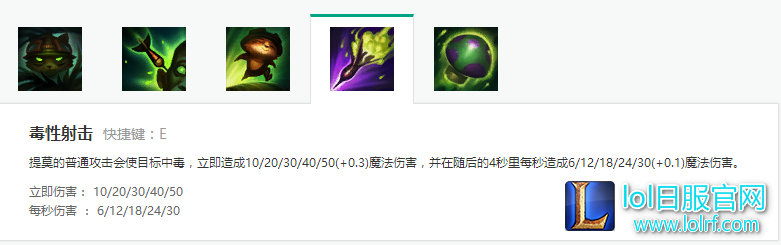 主E副Q,一级点E,E技能被动中毒掉血量,与法强有关系,是提莫对线的主要消耗技能。Q技能致盲,比较克制依赖普攻的AD和蛮子等英雄,W技能增加移速,没有伤害能力,因此最后点满。