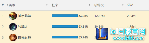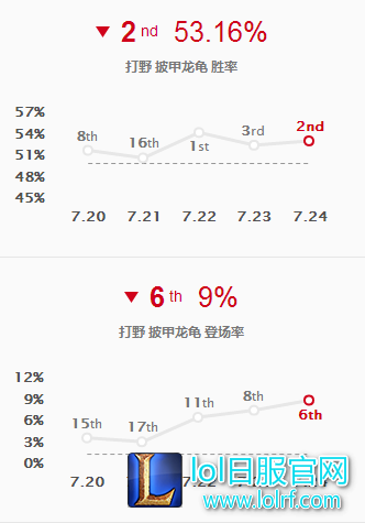 龙龟从7.22版本以后,胜率排行榜上以53.95%的胜率占据榜首,虽然胜率略有浮动,龙龟的胜率始终没有跌出前三。龙龟的登场率也连创新高,在打野英雄中以9%排名第6。