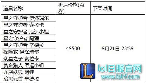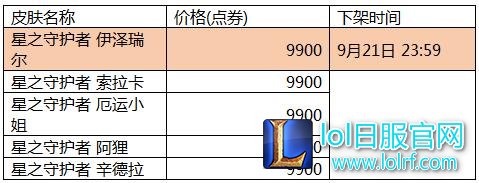 其中星之守护者伊泽瑞尔是六周年限定皮肤,将会在9月21日 23:59下架。 同时我们还将发布 星之守护者2017 星光起源大礼包 里面包含所有的 星之守护者2017 星光起源版的皮肤以及对应的英雄,仅售49500点券(如果你已经拥有其中部分英雄或者皮肤会从总价中扣除)