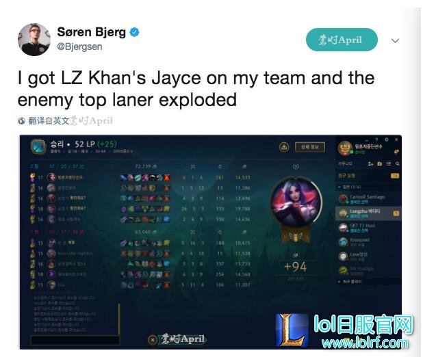 9月14日凌晨1点左右,TSM中单Bjersen发推称,自己排位时碰到龙珠的Khan在自己这队,他选了杰斯,然后对面上单炸了。
