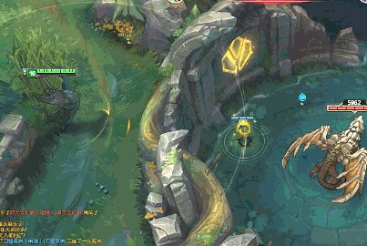 相信大乱斗模式大家都玩过,在极地大乱斗这张地图上,是可以走到草丛边缘的,这里的边缘要比召唤师峡谷中的边缘远很多,大家不难从图中发现,我们已经找不到人了,那么人究竟在哪呢,其实就是通过边缘的极限位置将人物模型卡在了墙里,让你变成“透明人”,这样就不会被敌人发现。 8、 小丑盒子的隐藏技巧玩小丑的玩家固然不多,知道这点的就更少了。小丑的盒子技能虽然能恐惧,但是却阻止不了敌人从空中跳过去的强制位移,比如小炮的W技能: