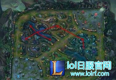 蓝色方速三抓下入侵路线,让上单帮忙打蓝BUFF,打完红以后到三级,入侵对面野区的蛤蟆或者抓中抓下,这个路线要保证己方中单或者下路有足够的控制能力和输出能力能够击杀,不然很拖发育。无论GANK是否成功,抓完下打石头人,抓完中打F6。