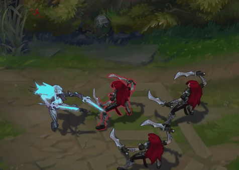 Q技能。跟劫一样,都是把自己身上固有的武器给丢出去,作为“冤魂”的他们武器的能力似乎更加强大。