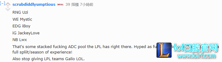 · RNG Uzi WE Mystic EDG iBoy iG JackeyLove NB Lwx 这是现在LPL赛区堆积的ADC选手们。期待iBoy和JackeyLove一整个赛季的表现 另外千万别给LPL放加里奥