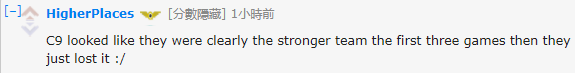 - C9在前三局比赛中看上去才是最强的那个,然后他们就输了 :/