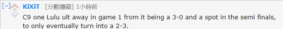 - C9离第一局的胜利、3:0结束的比赛和四强的席位就差璐璐的一个大招,然而最后变成了2:3