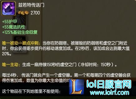 兹若特传送门这件装备本身合成非常的平滑,作为一件防御装只需要2700g,双抗各增加了55点,还有125%的基础生命回复。除此之外就是据点冲刺这个被动,当靠近防御塔,被摧毁的防御塔基和虚空之门之门附近时候就能获得移速的加成,最高为20%。简单的来说,假设你是300移速的英雄,那么在塔下发育就能获得最高60点移速,比三速的轻灵鞋移速还高,在合成时候的小件猛禽斗篷也具备这个被动。 另一个主动技能就是这件装备的核心,可以召唤一个持续150秒的虚空之门,一共有5格血,会被5次普攻打掉。这个传送门持续期间,每隔4秒就能召唤一个虚空兽,不仅可以帮你打钱,还能消耗防御塔的血量,后期是分推神器。正因为如此,使得传送门成为了一件团队核心装,优势的时候分推无解,逆风了被破水晶也可以用来守兵线。除了双C外都可以出一个传送门来增加兵线上的主动权。 经过我这一波疯狂毒奶,是不是觉得传送门是一件无敌的装备?没错,正因为优点太多,但是缺点也会随之暴漏出来,今天就给大家介绍3个英雄,如果你在对线他们的时候也出了传送门,那么不好意思,这个游戏已经无法玩了,到底是什么样的英雄克制传送门呢?