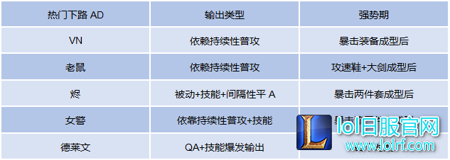 进入S7,大家有个普遍的认知就是,ADC废了,上分什么的也是考虑中上野优先。但是实际上,在ADC普遍“废了”的大背景下,在外服却有这么一位ADC以极高的胜率登顶榜首,相信说出名字大家一定不会陌生——德莱文。 德莱文为何高胜率?在介绍这个英雄之前,先思考一个问题,为什么普遍被认为“团战废物”的德莱文会第一次有这么高的胜率? 这点需要联系到S7下路AD的普遍情况来说。在S7中对于其他路,增加了很多功能性,有一些英雄利用巨像可以拥有无解的护盾,还有一些英雄拥有极其恶心的Gank和击杀能力,就比如说刚出来的新英雄卡蜜尔。这样导致原本在S3S4曾经称霸版本的AD生存越来越危险,线上的压力也越来越大。 这个版本绝大部分AD在前期几乎无法取得绝对性的优势,甚至绝大部分的人头都是给一些进攻型的辅助获得的。在团战中ADC的生存环境越来越差,可能随时随地切过来一个狮子狗或者妖姬瞬间秒杀,这样线上不行,团战不行,想要靠打爆下路来带领团队走向胜利是不可能的。 归根结底,就是因为绝大部分ADC的输出特性发生变化:像VN,金克丝,老鼠这些英雄想要打出伤害需要预热一段时间,但是他们又普遍是没有位移的,在预热的这段时间很容易被敌方的下路组合骚扰。 像卢锡安,烬这类英雄虽然输出能力稍微提升,但是卢锡安输出能力明显乏力,相比于S6中期的时候已经是天差地别。烬的输出频率太慢,如果遇到高攻速的敌人跟你对砍不一定拼得过。我们可以看一张表格。