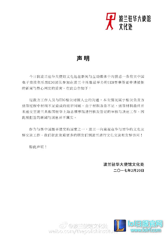 波兰驻华大使馆:EDG并未递交送签材料,lol日服 时间:2017-02-20 19:39 来源:www.lolrf.com 作者:lol日服中文网 点击:次 今日下午,波兰驻华大使馆文化处微博发表官方声明,表示EDG团队IEM签证并非此前新闻中传出的“被拒”,而系其材料准备不足,未递交波兰驻华总领事馆进行审核。 下图为声明原文: 再逛逛>> 更多资讯请关注lol日服 (责任编辑:lol日服中文网)