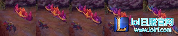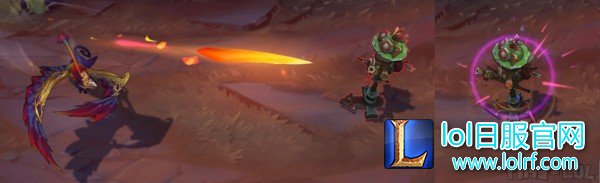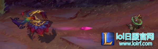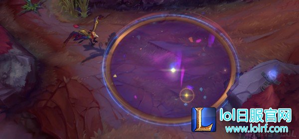 W由于是可成长的技能所以小编用静态图片来代替GIF图。W技能由于技能等级不同形态也不一样:在等级低的时候只有橙色和紫色两种渐变色,上面的彩带也只有一跨。随着等级增加,W颜色逐渐显现出完整的渐变色,上面的彩带也同时增加。这可以说是英雄联盟中最华丽的地形技能没有之一了!