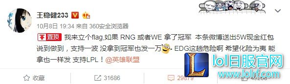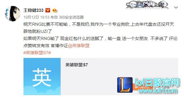 在S7刚开打的时候,老王就发过一条微博,只要有LPL队伍夺冠就送5W现金红包,即使最终没夺冠也会送出1W红包,可以说是十分豪气了。而在小组赛进行时,作为RNG铁粉的老王又在微博发声:RNG一场都不会输,输了就送女朋友。可以看出老王为了RNG真的是连家庭和谐都不顾了,相当的拼。